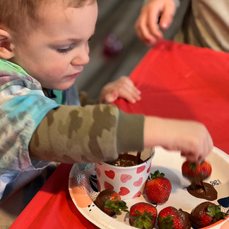 One of my absolute favorite traditions to do with the kids is making chocolate covered strawberries each year on Valentine’s Day. It’s messy and delicious and everything A child loves. Each child dipped their fresh strawberries into melted chocolate, their eyes widening with anticipation. Some children chose to save them for their parents and some children ate them all as quickly as they made them. And if you decided to just eat their strawberries and drink the chocolate straight out of their cup lol. Each creation unique and delicious. Witnessing their pride in crafting their own treats was heartwarming.