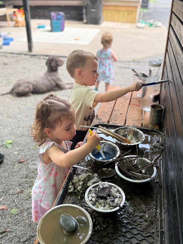 The mud kitchen has become a creative haven. I added a chalk mortar and pestle, and the kids have been making their own “paint” grinding, mixing, and getting gloriously messy. It’s a perfect blend of creativity and fine motor skill development, and they are fully immersed.